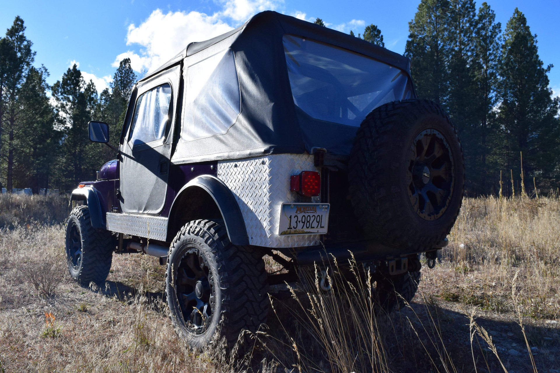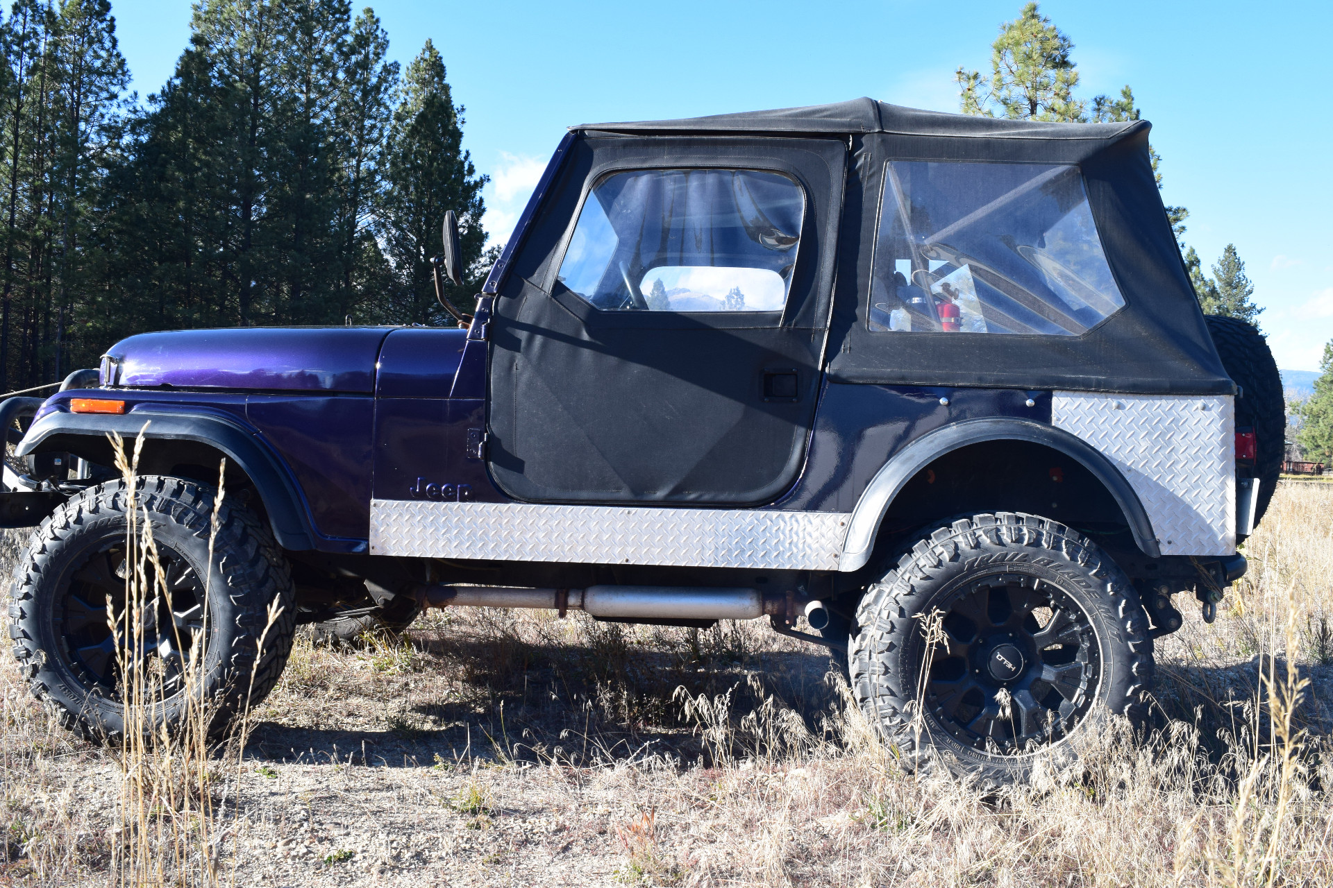 This is a very clean 1976 CJ-7 with significant investment in upgrades. She is powered by the 304 V8 with a mild cam and mated to the Turbomatic 400 3 speed automatic with dual exhaust. There is power steering and brakes. The body was removed for paint which is in great shape and is a nice deep purple. Underneath features an upgraded YJ suspension with the Quadratrac H-N-L part-time 4-wheel drive. You have a Dana 35 up front with locking hubs and Dana 20 wide track rearend featuring 3.54 open differential gears. There’s also a new Smittybilt 9500 winch up front, fog lights, removable tow bar and swing away tire carrier to the rear with LED brake lights.